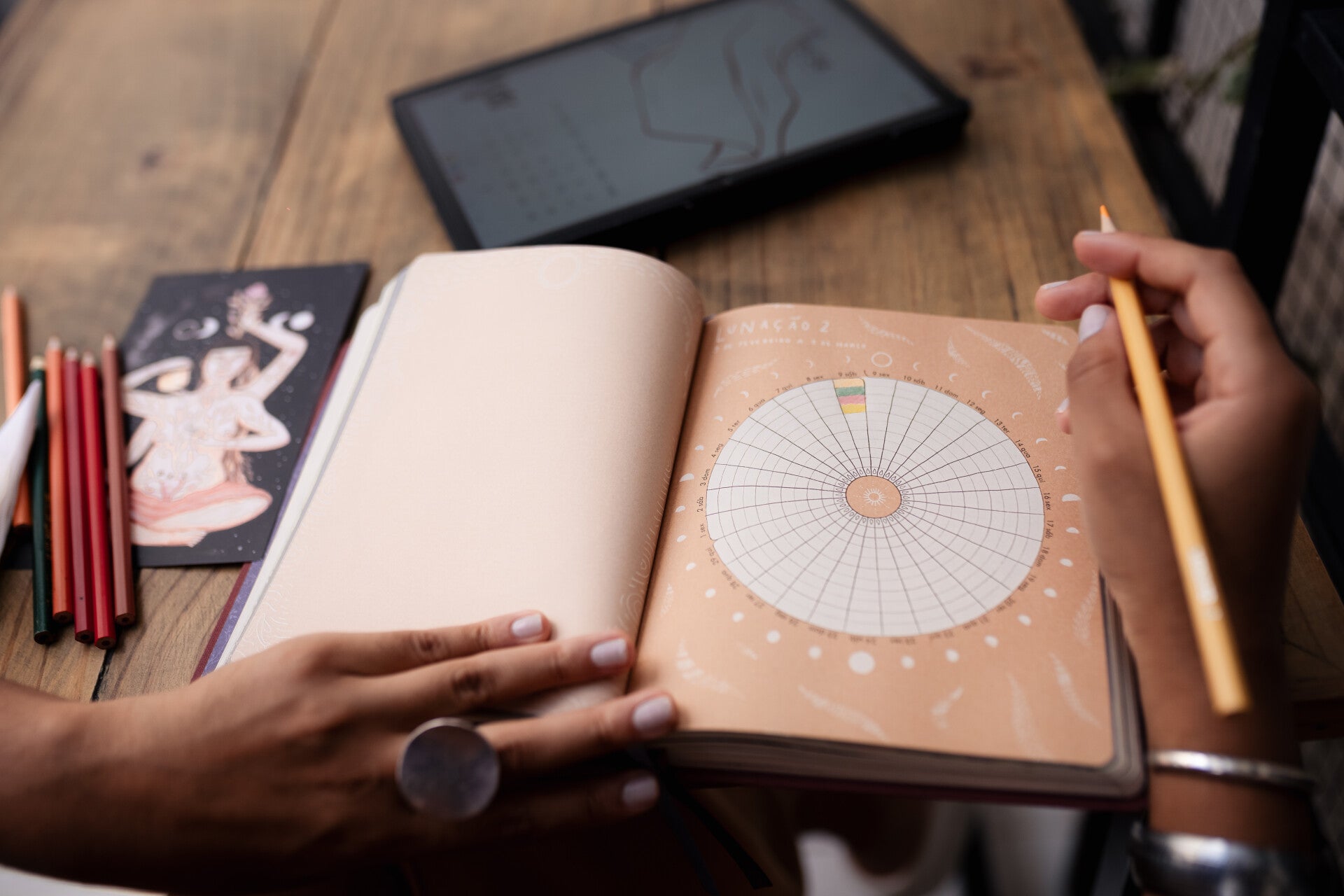 With this book you can follow the gregorian calendar as well as lunar calendar. It is a strong self knowledge tool that supports us on exploring the influences around us. Learn how to create your very own mandala following your menstrual cycle and all the factors that personally surrounds you physically, emotionally and naturally. Yes! you can also learn about natural forces such as astrology and nature itself by the seasons, all explored in your Mandala Lunar.